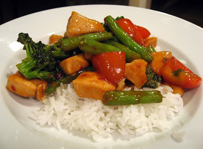 This recipe can be found on allrecipes.com and has pretty high reviews there too. The recipe calls for white wine, which I omit because I rarely have it. It also calls for water chestnuts, which adds nice crunch. But, as I mentioned before, the veggies you throw in are totally up to you. My favorites are bell peppers and broccoli. The night I took this photo I also had some green beens that I tossed in. The sauce doesn't make very much, so I'd recommend doubling or tripling it if you want some extra sauce to pour over your rice.